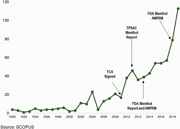 They highlight the fact that, as the research base on the harms of menthol since 2009 has quintupled since 2009, the FDA has not addressed menthol (see figure from their paper).