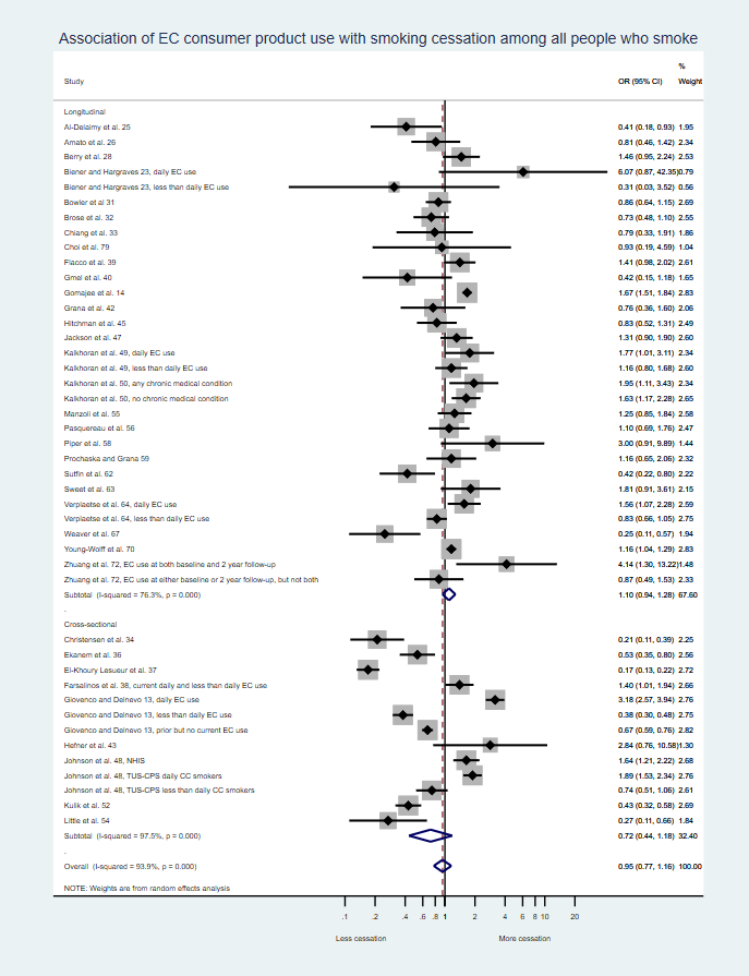 But these observational studies assess the effects of e-cigarettes as consumer products on cigarette smoking is what is relevant to the Center for Tobacco Products assessment of e-cigarettes as consumer tobacco products and they show that, on average, e-cigarettes as consumer tobacco products are not associated with increased smoking cessation.