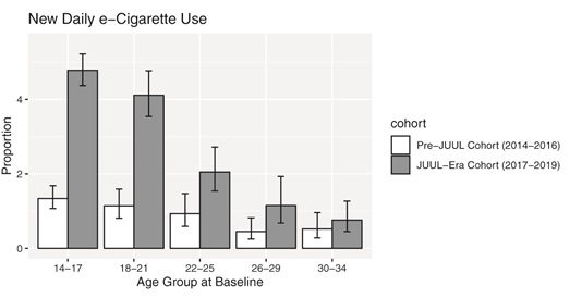 Results: Sociodemographic variables and rates of experimentation with any tobacco product were similar between cohorts. Among baseline nondaily tobacco users, only those aged 14 to 17 years had an increase in the 2-year incidence of new daily tobacco use (2014 cohort = 4.8%, 95% confidence interval 4.3, 5.5 vs 2017 cohort = 6.3%, 95% confidence interval 5.8-7.0) to rates approaching those in the 1990s. In 2019, three-quarters of new daily tobacco users aged 14 to 17 vaped daily and had e-cigarette dependence scores similar to daily cigarette smokers and older adult e-cigarette vapers. We estimate that about 600 000 Americans aged <21 years used JUUL products daily in 2019, a rate 2.5 times those aged 25 to 34 years.
