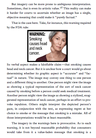 In contrast to his art criticism, Judge Campbell ignores the question of whether the images somehow make the text warnings any less “factual and uncontroversial,” the legal standard. He also ignores the broader scientific literature and the studies the FDA conducted on the specific warnings and images in its rule that show that the images enhance the consumer’s understanding and recall of the (unconested) textual messages.