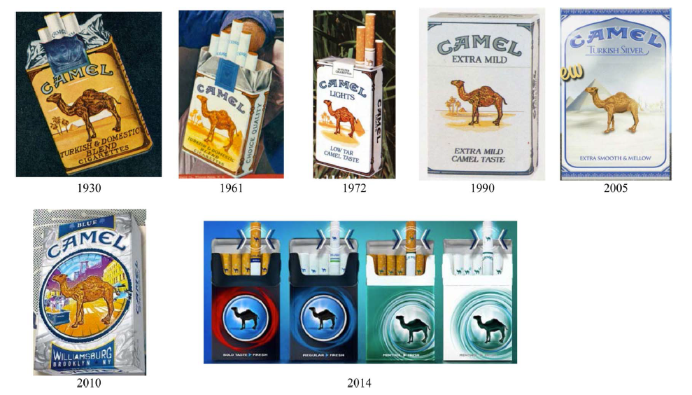 Top: Examples of changes in Camel pack designs from 1930 through 2005, illustrating how RJR changed pack colors to affect consumers’ perceptions of the cigarettes’ taste, with progressively lighter colors and more white conveying ‘low tar’ taste, ‘extra mild’ taste and ‘extra smooth and mellow’ taste. Bottom: Examples of Camel pack designs after enactment of the US Family Smoking Prevention and Tobacco Control Act in 2009, including a 2010 from RJR’s ‘Break Free Adventure’ that uses the word ‘Blue’ in lieu of the newly forbidden identifiers ‘low’, ‘light’ or ‘mild’, and Camel Crush that use black and red colors for ‘bold taste’ and green and white colors for ‘menthol fresh’ taste. See Lempert and Glantz (2016) for underlying research and links to source industry internal documents.