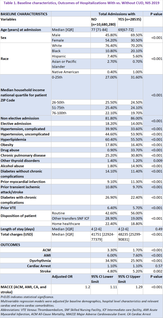 Methods: The National Inpatient Sample (2019) was queried using relevant ICD-10 codes to identify elderly (>65 years) admissions with established CVD risk without known tobacco use disorder and stratified into CUD and non-CUD cohorts. Logistic regression evaluated MACCE odds as primary outcomes and secondary outcomes as predictors of MACCE incidents in CUD users. P< 0.05 was considered significant.