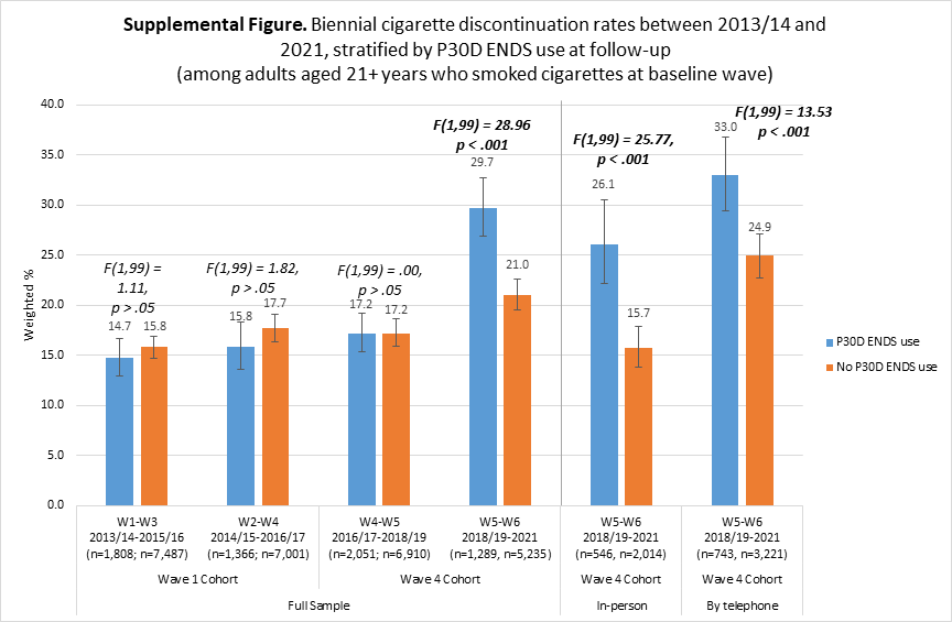 Aims and methods: U.S nationally representative data from adults in the Population Assessment of Tobacco and Health (PATH) Study (2013/14-2021, Waves 1-6) who smoked cigarettes in the past 30 days (P30D) were analyzed (n = 13 640). The exposure was P30D ENDS use. The outcome was P30D cigarette discontinuation at biennial follow-up. Weighted trend analyses were conducted to test for differences in cigarette discontinuation trends by ENDS use.