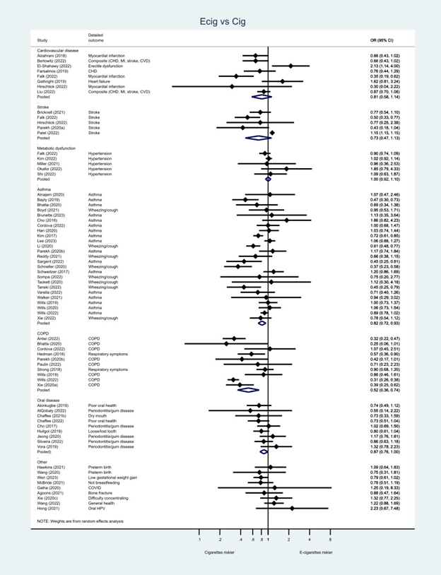 These are the same conclusions we reached in our meta-analyses of 107 papers available as of October 1, 2023, when we completed the search for our NEJM Evidence paper Population-Based Disease Odds for E-Cigarettes and Dual Use versus Cigarettes (one page plain English summary). For comparison, here are the meta-analysis results from all 107 studies included in our paper: