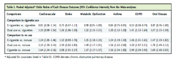 Meta-analyses of these 92 papers conducted using the same methods that the RCP used in its meta-analyses of biomarkers (figure and table below) shows that for cardiovascular disease, stroke and metabolic disorder e-cigarette risks are similar to cigarettes and for respiratory and oral disease, while lower risk than cigarettes, the risks are still substantial. Dual use (using e-cigarettes and cigarettes at the same time) is riskier than smoking alone for all outcomes.