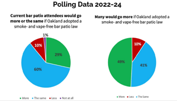 Surveys in Oakland reported in the LGBTQ Minus Tobacco and the Alameda County Tobacco Control Coalition’s slideshow (slide 14) provided consistent local results: Patrons would not change their behavior if patios were smoke-free or they would go to bars with patios more often.