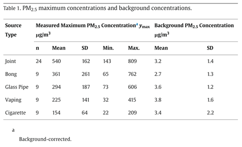 The study “Measuring indoor fine particle concentrations, emission rates, and decay rates from cannabis use in a residence” reported the level of ultrafine air pollution (PM2.5, particles smaller than 2.5 µm in diameter, about 1/50 to 1/00 the size of a human hair) in a residence after smoking or vaping cannabis compared to smoking a Marlboro tobacco cigarette:
