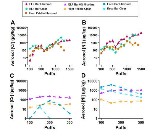 The figure to the right shows differences in chomium (Cr) and nickel in the aerosol that users inhale across brands and how delivery changes as the e-liquid is consumed, with exposures increasing as the e-liquid is consumed in some brands.