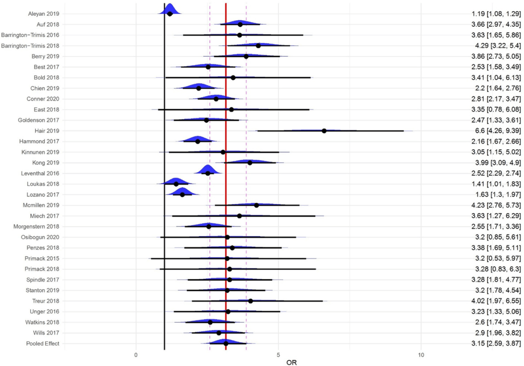 Kaur and colleagues searched the literature for earlier reviews and meta-analyses of the association between e-cigarette use and subsequent smoking. They found 13 qualifying meta-analyses, extracted the results from the 31 studies that one or more of the earlier meta-analyses used and conducted a fresh analysis of these 31 studies. (They did this rather than just using the 13 meta-analysis results to avoid double counting the individual studies.