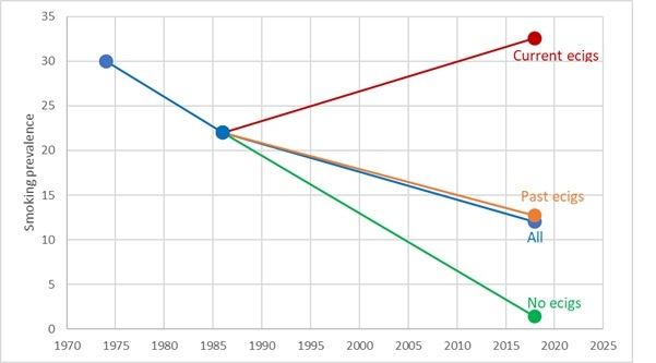 Jessica Mongilio and colleagues just published an innovative approach to assessing the association between e-cigarette use and smoking, the so-called gateway effect, that provides insights between the link between e-cigs and smoking and how it relates to changes in youth smoking prevalence over time. In their new paper “Risk of adolescent cigarette use in threeContinue reading “In UK 7 times more 16-17 year olds smoking than if there had been no e-cigs”